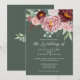 Un elegante diseño de acuarela con grandes peonías y rosas en tonos de rosa polvoriento con hermoso follaje de eucalipto sobre un fondo verde salvia. La parte posterior de la tarjeta tiene el fondo verde salvia con un pequeño arreglo floral en el centro. Esta hermosa invitación es parte de un conjunto de boda a juego que se puede personalizar completamente.