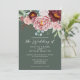 Un elegante diseño de acuarela con gran peonía y rosas en tonos de rosa polvo con hermoso follaje de eucalipto sobre un fondo verde salvia. La parte posterior de la tarjeta tiene el fondo verde salvia con un pequeño arreglo floral en el centro. Esta hermosa invitación es parte de un conjunto de boda a juego que se puede personalizar completamente.