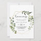 La invitación a la fiesta de cumpleaños de la quinceañera es perfecta para una familia moderna y los amigos cumplen 15 años juntos. El diseño está decorado con hermosas hojas verdes pintadas a mano, adornando un marco geométrico dorado.