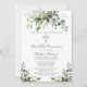La moderna y elegante invitación a la Primera Santa Comunión incluye hojas de eucalipto acuarela y otros hermosos follajes de vegetación botánica. Cruz de Plata.