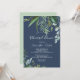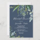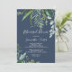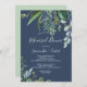 Esta ambiciosa cena de verano, con la marina, es perfecta para un elegante ensayo boda a mitad de verano. El diseño botánico presenta una disposición exuberante de eucalipto de acuarela pintada, vegetación y hojas verdes sobre un fondo azul marino.