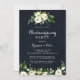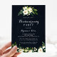 Esta verde y blanca invitación a una fiesta floral de otoño es perfecta para una nueva celebración rústica. El diseño presenta elegantes peonías blancas acuarelas con follaje verde en un fondo azul oscuro.