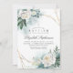 Vegetación de color de agua, marco geométrico de oro e invitaciones de bautismo de peonías blancas