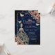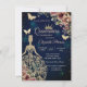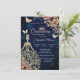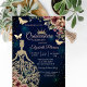 Tocado de purpurina dorada, vestido, estrellas, mariposas y flores sobre un fondo azul. Invite a los invitados a unirse a usted en la celebración de este hito con un diseño que refleja la magia y la alegría de su quinceañera.