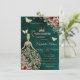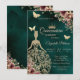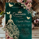 Tiara de brillo dorado, vestido, mariposas y flores sobre un fondo verde. Invite a los invitados a unirse a usted en la celebración de este hito con un diseño que refleja la magia y la alegría de su quinceañera.
