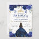 Elegante acuarela Brunette princesa Haired en el diseño de vestido azul de la Marina con flores azules, mariposas y confeti purpurina de oro.