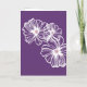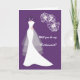 Vestido de novia blanco sobre fondo púrpura y flores blancas tarjeta de saludo de solicitud de dama de honor. Puede ajustar el texto según sus necesidades.