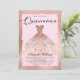 Invitación de Quinceañera elegante con lámina y brillo en rosa oro que presenta vestido rosa oro y marco rosa oro con elementos brillantes. Personalice con detalles de la fiesta en letras mayúsculas de moda.