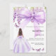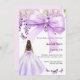 Un elegante fondo blanco, decorado con una gran lavanda, un arco violeta, flores de glicinia, mariposas y un chica vestido. Personalice y agregue un nombre y detalles del fiesta.