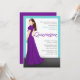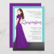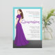 Invitaciones púrpura y turquesa para el cumpleaños de Quinceañera con un ilustracion de una morena con el pelo largo llevando una tiara y un hermoso vestido púrpura real, para el cumpleaños 15 de su hija.