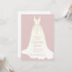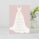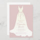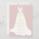 El principal atractivo de esta invitación a la ducha de novia es un bonito vestido de boda. El traje de marfil de color marfil, con detalles florales, está colocado sobre un fondo rosa claro.