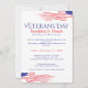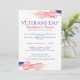 Invite guests to honor America’s heroes with this elegant red, white, and blue Veterans Day event invitation. Perfect for luncheons, breakfasts, parades, fundraisers and community recognition events. Customizable for organizations, campaigns, and schools.