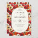 This vibrant wedding invitation features a lively floral pattern with rich reds, oranges, and creams, creating an energetic yet elegant atmosphere. The central oval frame elegantly displays the text in a classic serif font, adding a touch of sophistication to the design. Perfect for a spring or summer celebration, this invitation exudes warmth and joy, inviting guests to partake in a memorable occasion filled with dinner and dancing. Its customizable layout allows you to personalize it for your special day, ensuring every detail reflects your unique style.