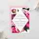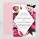 Elegantes invitaciones florales de boda con los detalles de tu boda dentro de un marco de diamante rodeado de hermosas peonías rosadas y rosadas vívidas con hojas verdes exuberantes. Las invitaciones a la boda peony se revierten a un fondo rosa claro con espacio para texto e imágenes adicionales.