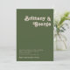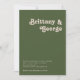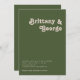 Las simples vigas retro | la invitación a bodas casuales verde oliva es perfecta para su boda de los tradicionales tonos de tierra. El diseño presenta una minimalista fuente hippie rústica tipo boho. La paleta de colores neutros del desierto del suroeste y las letras bohemias de mediados de siglo se combinan para un diseño perfecto y minimalista moderno de destino occidental. No dudes en cambiar el color y añadir tu propia obra de arte, gráficos o fotos. Si tiene alguna pregunta sobre el diseño de este producto, por favor, no dude en ponerse en contacto con nosotros.