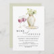 Invitaciones para adultos con temática vinícola que incluyen un ilustracion acuarela de dos vasos de vino tinto junto a un plato de cucharas de queso. Se puede cambiar a cualquier edad. Escena de la tabla con los detalles del evento a continuación. El reverso es un verde claro que coordina.
