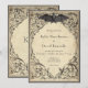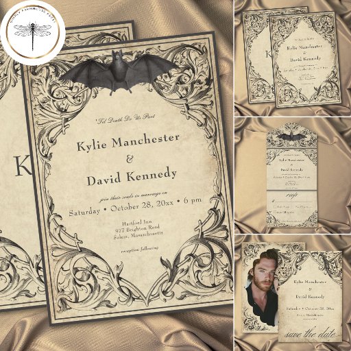 Elevate your gothic wedding with a Victorian-inspired invitation that exudes timeless elegance and mystery. Designed to resemble an antique book binding, this stunning design features intricate a black lacey filigree on an aged parchment background, evoking the charm of a bygone era. At its pinnacle, an old-world bat adds a touch of dark romance, perfect for setting the tone for your unique celebration. The back holds the first initials of the couple. The wording, "Til Death Do Us Part" can be edited and changed, or deleted entirely, if you prefer. Let your love story unfold with an invitation as unforgettable as your day. Created by Simply Farmhouse Press.