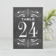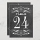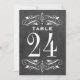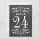 Vintage style wedding table number cards feature decorative white swirls and flourishes on both sides of the card. Background has a rustic black chalkboard textured appearance. Personalize each table number card that you need and add each to your cart individually.