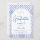An elegant graduation celebration design featuring a delicate blue toile floral border inspired by classic European porcelain and vintage botanical prints. The intricate florals frame a clean arched center panel, creating a refined and timeless composition that highlights the graduate’s name and event details beautifully. Soft blue tones against a crisp ivory background give the design a sophisticated yet celebratory feel. Perfect for a stylish graduation gathering with a classic, romantic aesthetic.