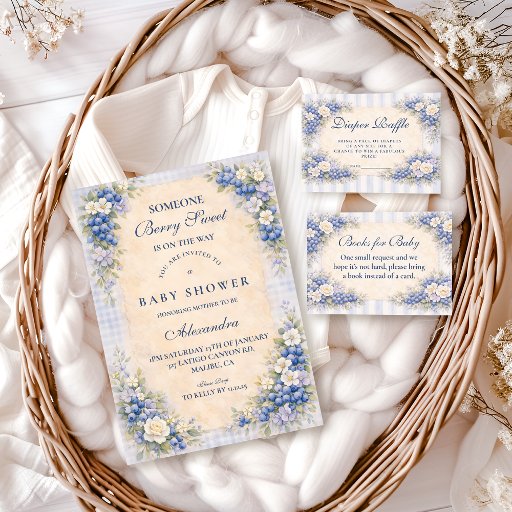 This romantic blueberry garden collection features soft watercolor blueberries paired with delicate white florals and elegant blue bows, all framing a warm parchment-style center. The palette blends ivory, blush, and dusty blue tones for a timeless, storybook aesthetic. Ideal for a sweet, refined celebration with a floral garden feel and classic charm.