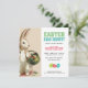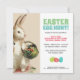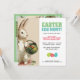 Un divertido conejo de Pascua vintage con cesta para una invitación de búsqueda de huevos.