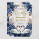 Set the tone for your formal evening union with this sophisticated design featuring romantic swans, deep royal blooms, and elegant vintage typography.This design features a digital illustration of two graceful white swans curving their necks to form a heart shape, set against a backdrop of a faint, ethereal gothic cathedral arch. The swans are nestled in a lush arrangement of deep navy and royal blue roses accented by autumn bronze and brown leaves. The couple's names are displayed in a bold, vintage Blackletter font, while the details appear in a refined script, both simulating a shimmering metallic texture against the dark background.