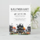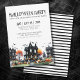 Bienvenido a tu fiesta de disfraces de Halloween con esta espeluznante y vintage invitación. El diseño presenta una combinación de colores en blanco y negro con una tipografía ornamentada y serif. En la parte inferior, varias casas oscuras y espeluznantes crean una escena de barrio espeluznante, acentuada por brotes de naranjas de calabazas, lámparas y árboles embrujados. Los fantasmas y murciélagos cúbicos añaden un toque caprichoso, mientras que la fuente angustiada aporta una vibración vintage inspirada en el grunge. En la parte posterior, las rayas blancas y negras completan el aspecto, pero se pueden cambiar los colores de fondo o de rayas para adaptarlos al estilo fiesta. Espectacular Vintage embrujó a la fiesta de Halloween en el vecindario, los fantasmas de las franjas. Disponible en forma de invitación impresa, o como una invitación digital descargable que puede enviar por correo electrónico o que ha impreso localmente.