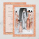 Dibujo retro de una fiesta de bodas de los locos veinte, originalmente de un ilustracion de revista. Novia vestida de manera vintage en la era del Jazz, con vestido boda y velo en gris y blanco, rodeada de damas de honor, chica de flores y ringarrador vestidos con tonos de naranja mandarina y gorras elegantes. El fondo es el grabado floral de flores naranjas de estilo vintage popular en los años 20. El reverso incluye detalles de la ducha de novia en personalizable que se pueden personalizar con el nombre de la novia, fecha, ubicación y detalles del registro de novias. La preciosa y asequible ducha de novia invita a disfrutar de la bebida Budget Bridal.