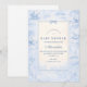 A classic powder-blue toile design inspired by traditional French countryside prints. Vintage nursery motifs — pram, rocking horse, lamb, pastoral village scenes and delicate ornamental borders — frame a clean, structured central layout. The soft ivory background paired with refined blue linework creates a timeless and sophisticated look. Perfect for a traditional baby shower with an elegant European aesthetic.