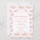 Celebrate a timeless and romantic baby shower with this elegant pink toile design, featuring delicate vintage countryside illustrations in soft blush tones. The refined arch layout creates a beautiful focal point for your event details, blending classic European charm with a modern, feminine aesthetic. Perfect for a chic, storybook-inspired celebration, this design feels both graceful and effortlessly sophisticated—ideal for creating a memorable and stylish gathering.