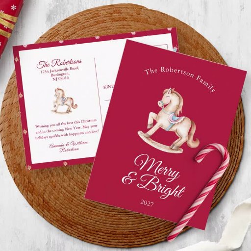 Share warm holiday wishes with this charming vintage Christmas card featuring a watercolor rocking horse on a rich red background. Perfect for families who appreciate classic holiday style, this card adds nostalgic charm and festive elegance to your greetings. Add your name or a special greeting for a timeless touch.