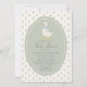 Sweet and timeless baby shower invitation featuring a charming storybook-style goose illustration with a soft blue bow, set inside a delicate scalloped frame. The gentle sage green center and tiny floral background create a romantic cottage-inspired look that feels warm, nostalgic, and beautifully refined. Classic typography and a balanced layout give this design an elegant, heirloom-quality feel perfect for a special celebration.