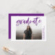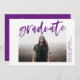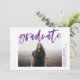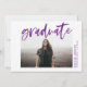 Invite a los huéspedes a celebrar el grado con nuestras invitaciones a la fiesta de graduación de Guión Moderno. La moderna fiesta de graduación invita a mostrar la foto del graduado enmarcada en blanco con "graduado" en un tipo de letra morado con acuarela. Personalice el frente agregando el nombre del graduado, el año escolar y el año de graduación. La parte posterior muestra los detalles de su fiesta en blanco debajo de la frase "¡Celebren el Grad!" y un fondo morado.