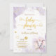 Invitación a la ducha con nene color agua violeta Rubor Pink Gold. Cute elefante, mariposa, corazones dorados y puntos alrededor, elegante guión manuscrito y fondo morado de color claro. El diseño es una mezcla de blancura, modernidad y elegancia. No olvides descubrir la colección completa.