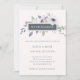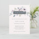 Estas encantadoras invitaciones para un brunch floral post-boda presentan flores de acuarela de color rosa rubor y violeta suave de moda, con hojas y acentos dorados falsos. El encabezado de la invitación presenta un marco central gris oscuro azul que dice "estamos casados", y la parte trasera de la invitación también es gris con un diseño floral a juego.