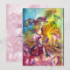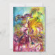Pintura en acuarela colorida, caprichosa y vibrante en colores brillantes amarillo, púrpura y azul inspirada en el Carnaval de Venecia. Arlecchina es la contraparte femenina de Arlequín