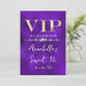 Esta invitación de fiesta personalizada presenta un diseño VIP glamuroso sobre un fondo de textura púrpura. El título VIP está impreso en una fuente de estilo de hoja de oro, seguido por el título del evento. Una banda de diamantes separa el texto. La ubicación y hora de la fiesta o evento están impresas en la parte posterior. Es perfecto para una fiesta de cumpleaños, sweet 16, despedida de soltera u otra celebración elegante.