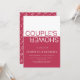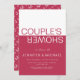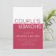 Esta invitación contemporánea a la ducha de bodas muestra un diseño elegante y elegante, incorporando vibva magenta y bloques de color blanco. La parte superior de la invitación está decorada en tonos blancos, mientras que la parte inferior está decorada con un cautivador tono magenta. El término 'COUPLE'S' está grácilmente inscrito en un llamativo tipo de letra rosa fucsia en el bloque blanco, mientras que 'SHOWER' está escrito creativamente de manera vertical usando un tipo de letra blanco en el bloque magenta. La estética minimalista se ve reforzada por el uso de un tipo de letra limpio y subestimado. En la parte trasera, las iniciales de la pareja se muestran elegantemente en blanco sobre un cautivador fondo magenta.
