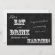 Esta divertida invitación a renovar la tipografía incluye las palabras "¡Comamos y BEBEMOS porque estamos CASADOS!" en la parte delantera del diseño junto con los nombres de la pareja y las palabras "estamos renovando sus votos". Los nombres de la pareja están sesgados como si alguien pudiera escribirlos en un pizarrón. En la parte posterior de la invitación están los importantes detalles de la invitación a la renovación del voto. Una manera única de invitar a sus invitados a una celebración de renovación de votos. Copyright henishouseofpaper