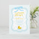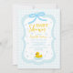 Baby blue gingham baby shower with a hand drawn bow. Water droplets frame a rubber duck surrounded by bubbles