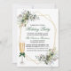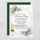 La elegante Invitación a la Fiesta de Acuarela de Verdor incluye una hermosa vegetación botánica acuática, hojas de eucalipto, bayas y otros hermosos follajes. Marco Geométrico Oro. Guión rojo. Vidrio de Champagne con Green Bow.