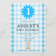 Perfect for baby's first birthday, this invite features an adorable giraffe with a charming watercolor check background.