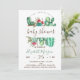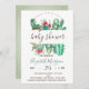 Invitaciones a una ducha de bebé con cactus acuarelas en la parte superior con puntos de polka verde.