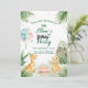 This invite features adorable cartoon dinosaurs, festive elements , tropical leaves, a volcano, balloons, and confetti in soft sage green, sky blue, and neutral beige — all in a watercolor illustration style with a minimalist layout.