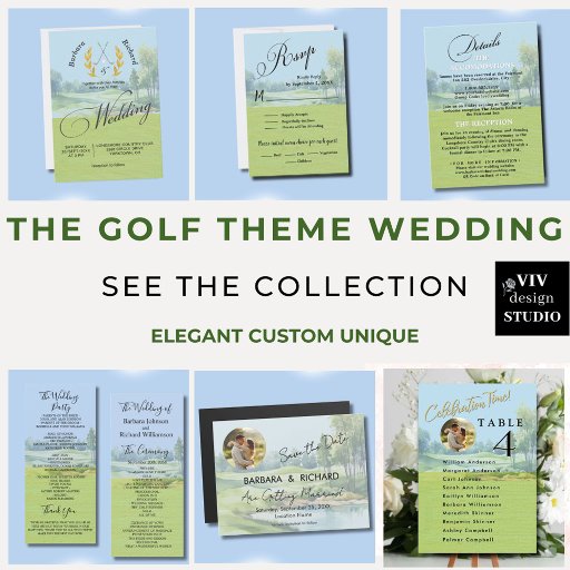 This watercolor elegant Golf course wedding invitation is the perfect way to announce your special day. It's a unique and special choice that will set the stage for your celebration. There is a second version minus the details on the back and located on a separate enclosure card instead, which is part of the collection suite. Much to personalize to make appropriate for your own event. We have all the ingredients to make it a special event — starting with a save the date, wedding invitations; welcome poster; guest book; wine labels, guest favors for example -- just ask! Any design questions, just send a message or an email to charmdesignstudio@rcn.com and we’ll be delighted to assist.