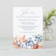 Esta romántica invitación a la boda tiene un tema floral de otoño en tonos polvorientos azules, beige y cobre. Flores acuáticas, bayas y follaje otoñal se colocan en la parte inferior para parecerse a un jardín salvaje. Las pequeñas bayas azules están enclavadas con flores de color cobre y hojas de color rojizo.
