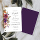 El borde izquierdo de esta romántica invitación a la boda cuenta con un ramo acuarela floral de ciruelas violetas, roya, flores de rubor y cobre y vegetación. El texto del personalizable combina escritura a mano, copperplate y cursiva en gris carbón sobre fondo blanco. El reverso es un violeta sólido de coordinación. ¡Ideal para una boda de otoño!