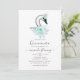 Elegantes invitaciones a la quinceañera con temática de cisne con tonos pastel de menta y azul acuático con purpurina plateado.