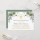 Modern Elegant First Holy Communion Invitation includes watercolor eucalyptus leaves and other beautiful botanical greenery foliage. Sage Green Back. Gold Cross.