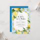 Invitación a la ducha de bebé con tema de limón con ilustraciones acuáticos de limones, flores de limón y tejas mediterráneas. Personalice agregando nombres, fecha, hora y otros detalles. Esta ducha de limón es perfecta para bodas de verano y duchas de bebé temáticas mediterráneas.